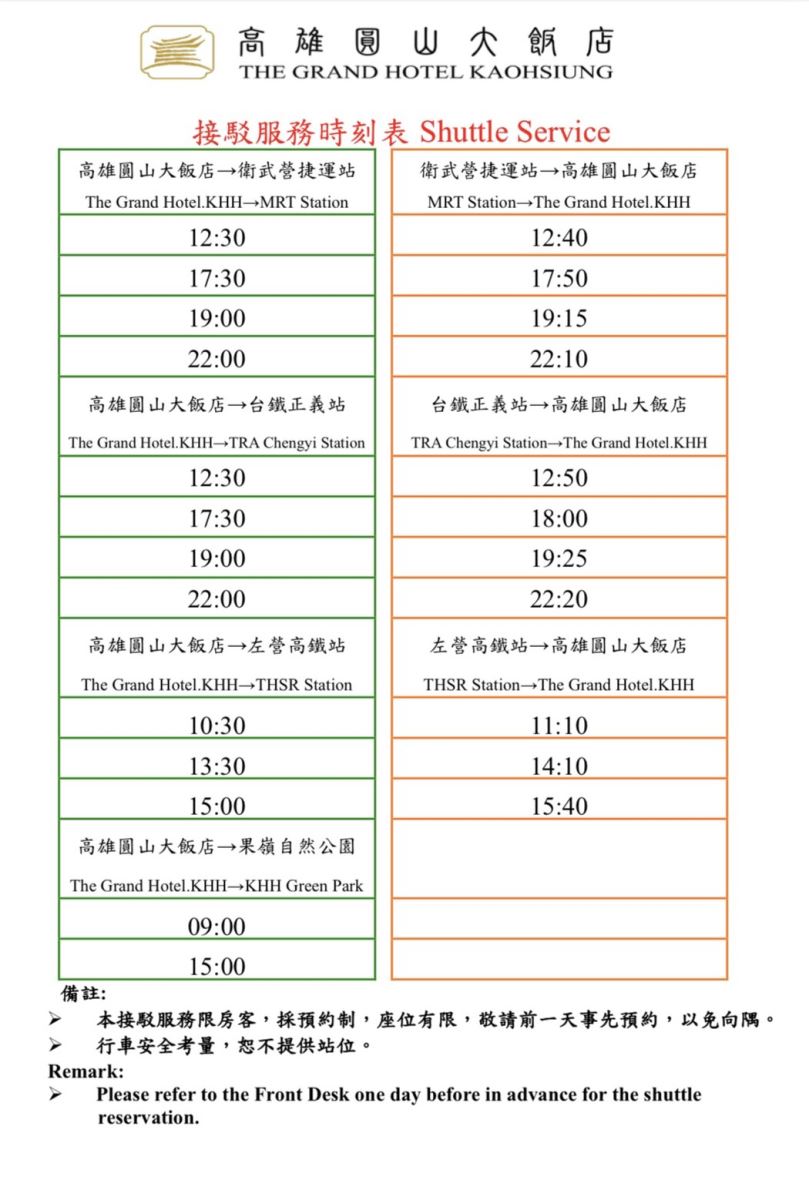 - MRTオレンジ色の線を利用してO10衛武営駅で下車し、黄色の2番バスに乗り、ホテルの入り口に到着します。