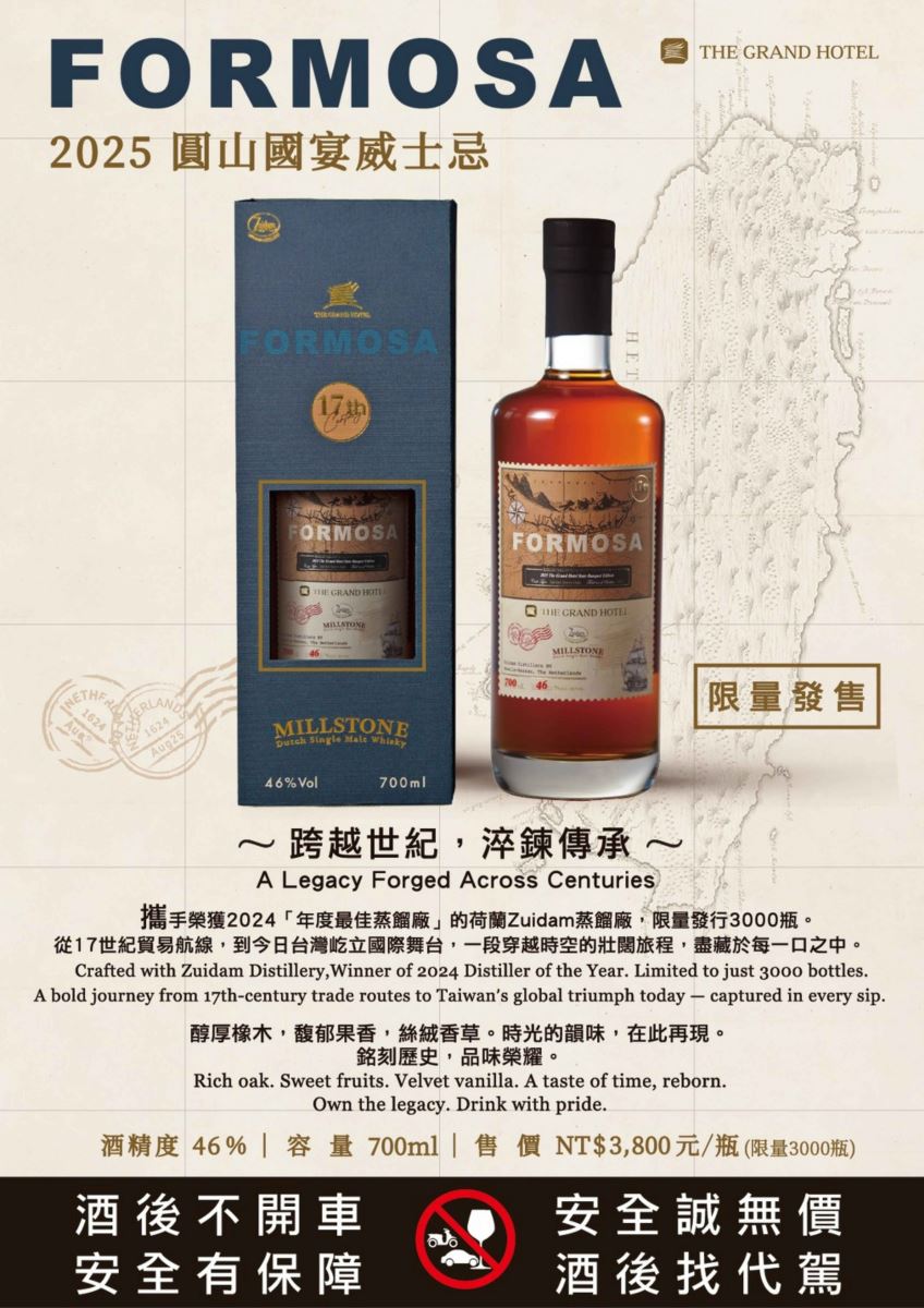 今年圓山大飯店以歷史為題,攜手榮獲「2024年度蒸餾廠冠軍 Distiller of the Year」殊榮的荷蘭Zuidam 蒸餾廠,推出限量3,000瓶的「FORMOSA 2025 圓山國宴威士忌」。以復古地圖為主視覺的酒標,重現17世紀荷蘭人來到台灣的場景,荷蘭作為十七世紀世界最大貿易強國,打破台灣在此之前的封閉經濟體,成就台灣發展國際貿易的歷史起點。四百年後的今天,時空移轉,台灣成為領先當代各國科技與貿易之強國。這款酒如同一封跨越400年的時光書簡,向台灣航向國際、走向世界的歷史篇章致敬。