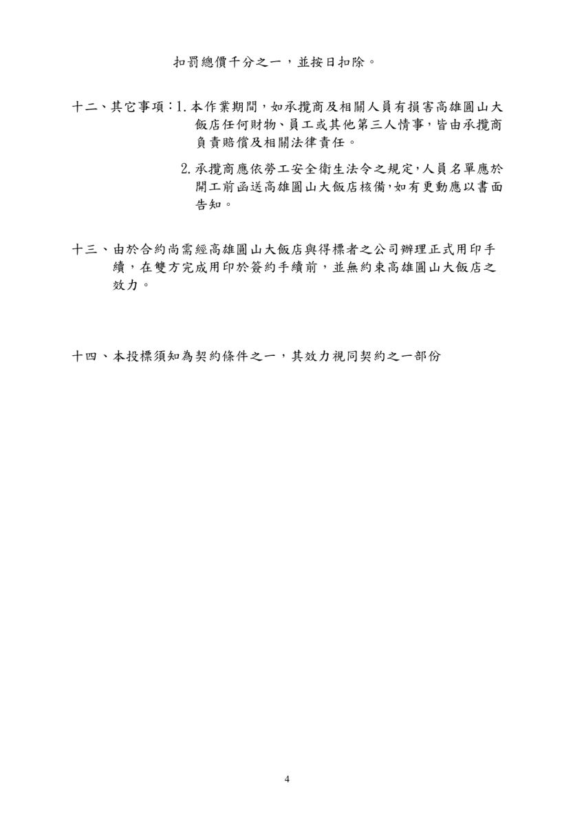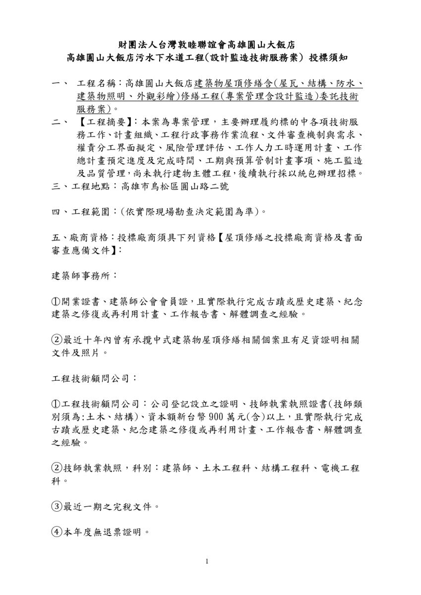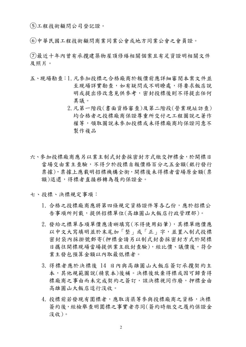 【履約保證金】:開標當日決標後,得標廠商交付之押標金(銀行發行票據)直接轉為履約保證 金,交由業主收執。 【屋頂修繕之投標廠商資格及書面審查應備文件】: 建築師事務所: ○1開業證書、建築師公會會員證,且實際執行完成古蹟或歷史建築、紀念建築之修復或再利用 計畫、工作報告書、解體調查之經驗。 ②最近十年內曾有承攬中式建築物屋頂修繕相關 個案且有足資證明相關文件及照片。 工程技術顧問公司: ○1工程技術顧問公司:公司登記設立之證明、技師執業執照證書(技師類別須為:土木、結 構)、資本額新台幣900萬元(含)以上,且實際執行完成古蹟或歷史建築、紀念建築之修復 或再利用計畫、工作報告書、解體調查之經驗。 ②技師執業執照,科別:建築師、土木工程科、結構工程科、電機工程科。 ③最近一期之完稅文件。 ④本年度無退票證明。 ⑤工程技術顧問公司登記證。 ⑥中華民國工程技術顧問商業同業公會或地方同業公會之會員證。 ⑦最近十年內曾有承攬建築物屋頂修繕相關個案且有足資證明相關文件及照片。 以上資料裝訂請使用A4尺寸;封面加註〔參加高雄圓山大飯店建築物屋頂修繕含(屋瓦、結 構、防水、建築物照明、外觀彩繪)修繕工程(專案管理(含設計監造)委託技術服務案) 〕。