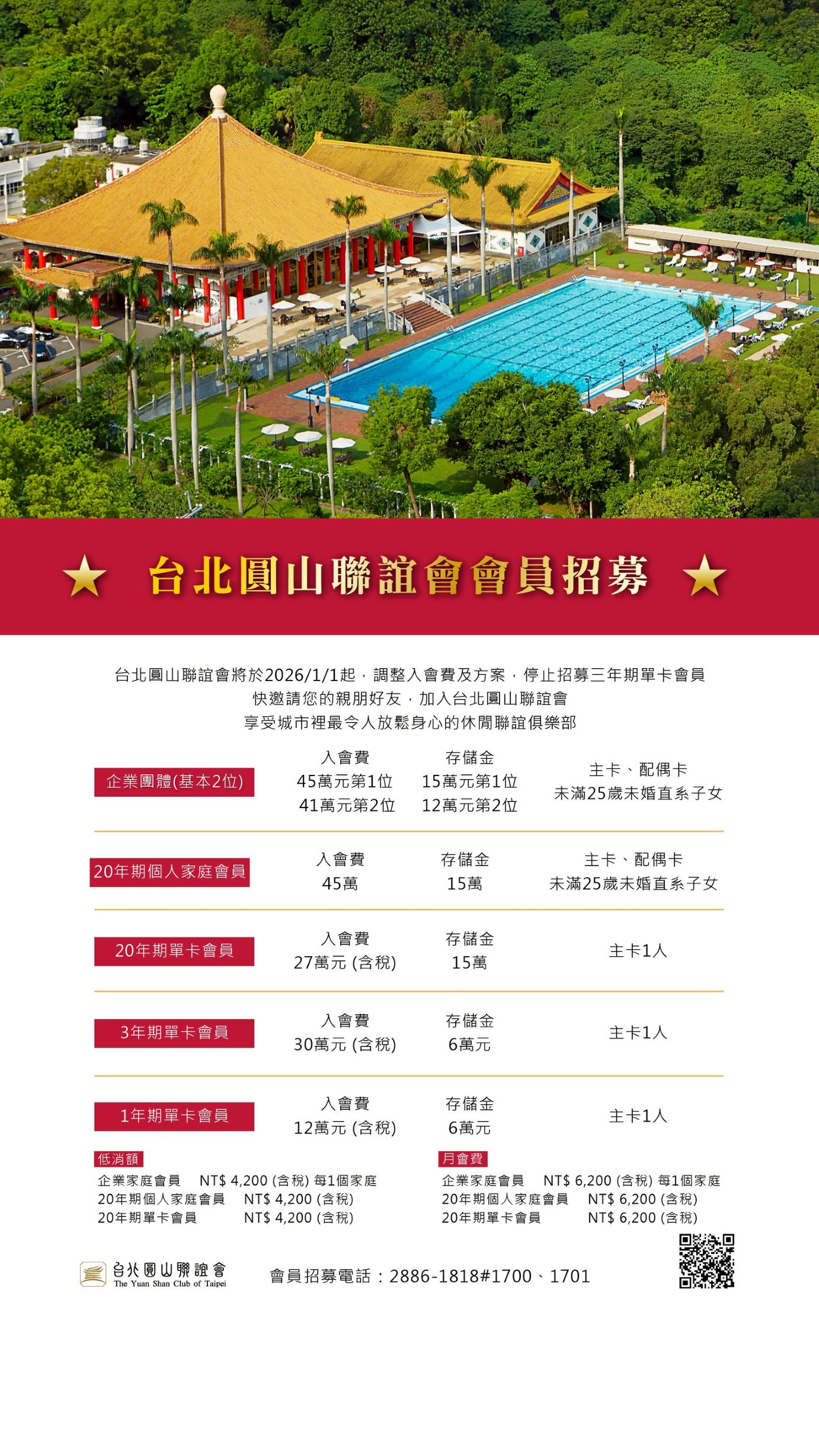 台北圓山聯誼會將於2026/1/1起,調整入會費及方案,停止招募三年期單卡會員