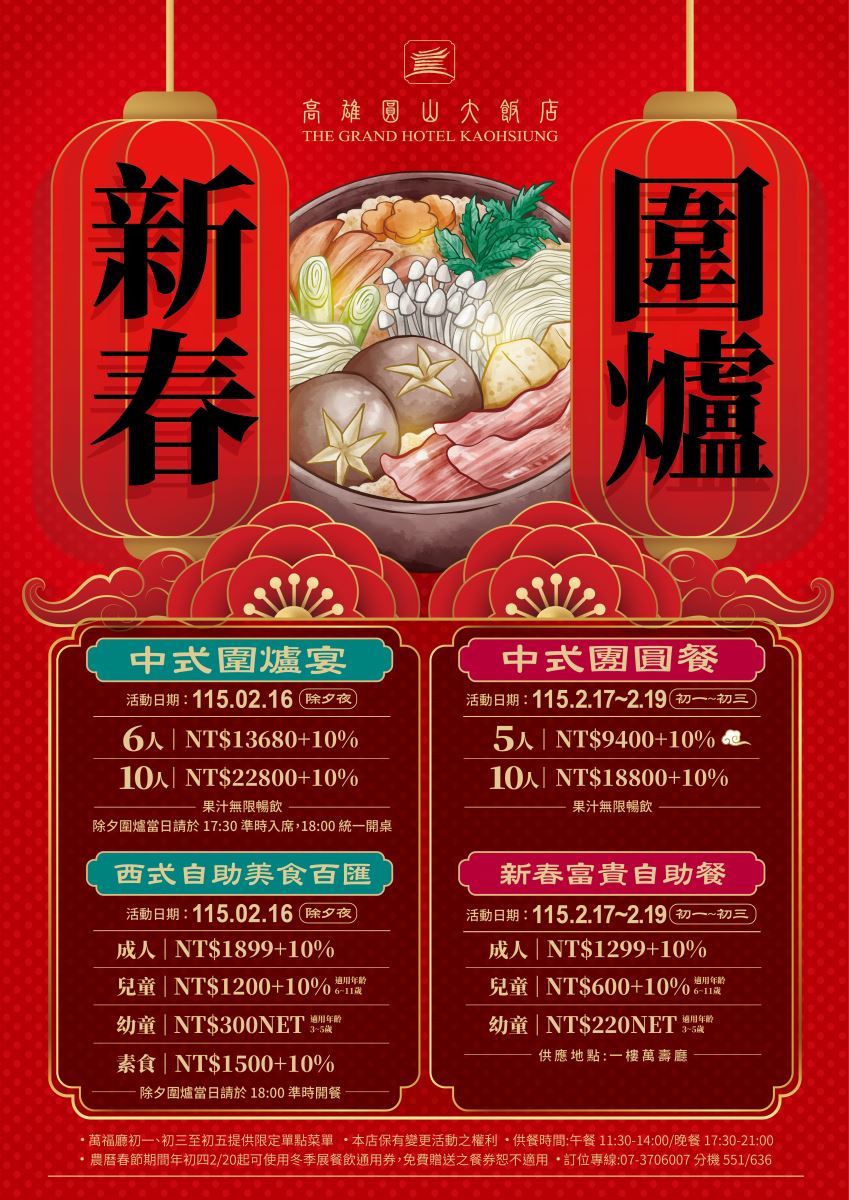 * 除夕圍爐當日請於17:30準時入席,18:00統一開桌