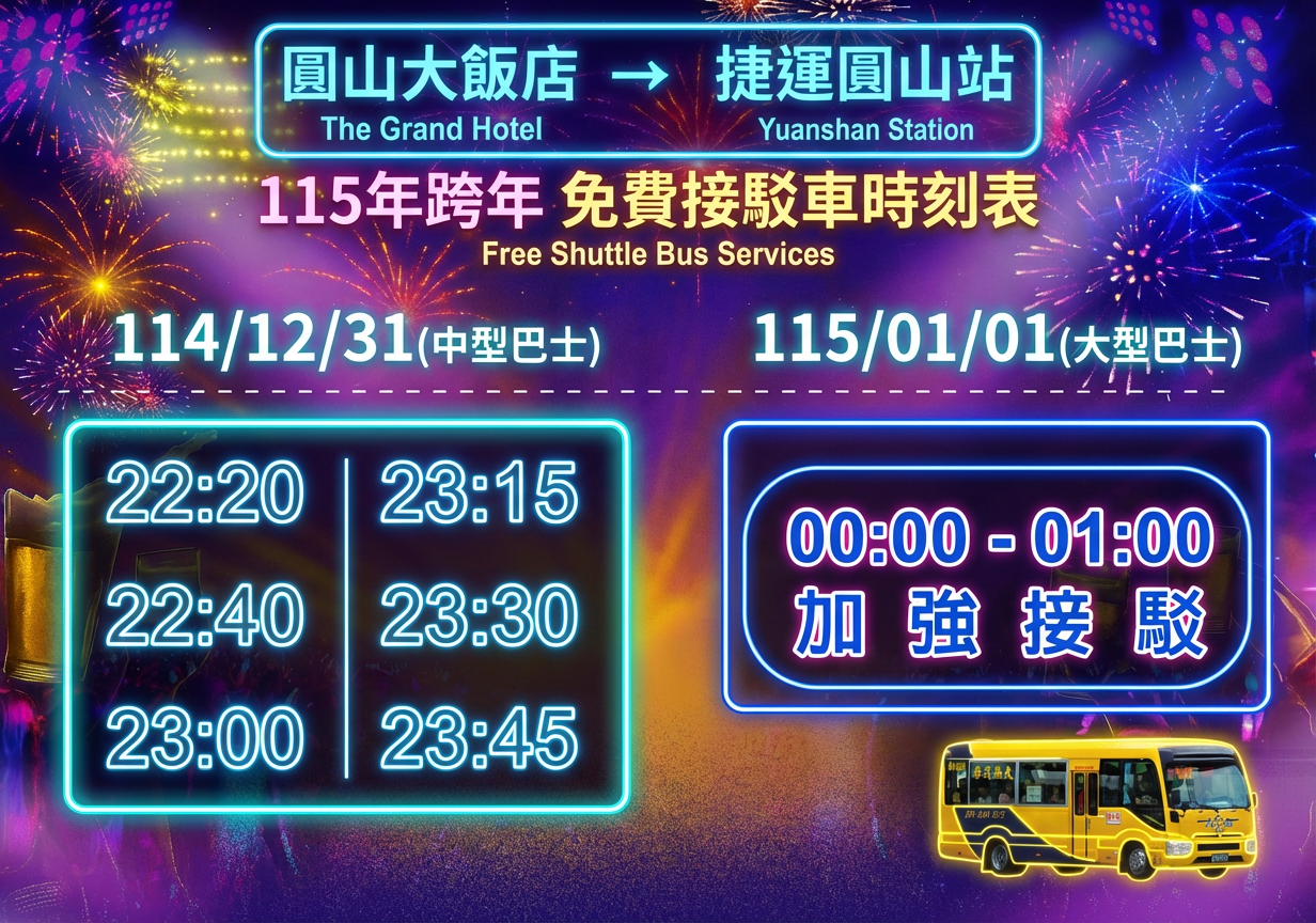 本飯店於跨年活動期間114 年 12 月 31 日晚間至 115 年 1 月 1 日凌晨,將加強 圓山大飯店 ⇄ 捷運圓山站 免費接駁車服務,相關時刻如下,敬請賓客多加利用。