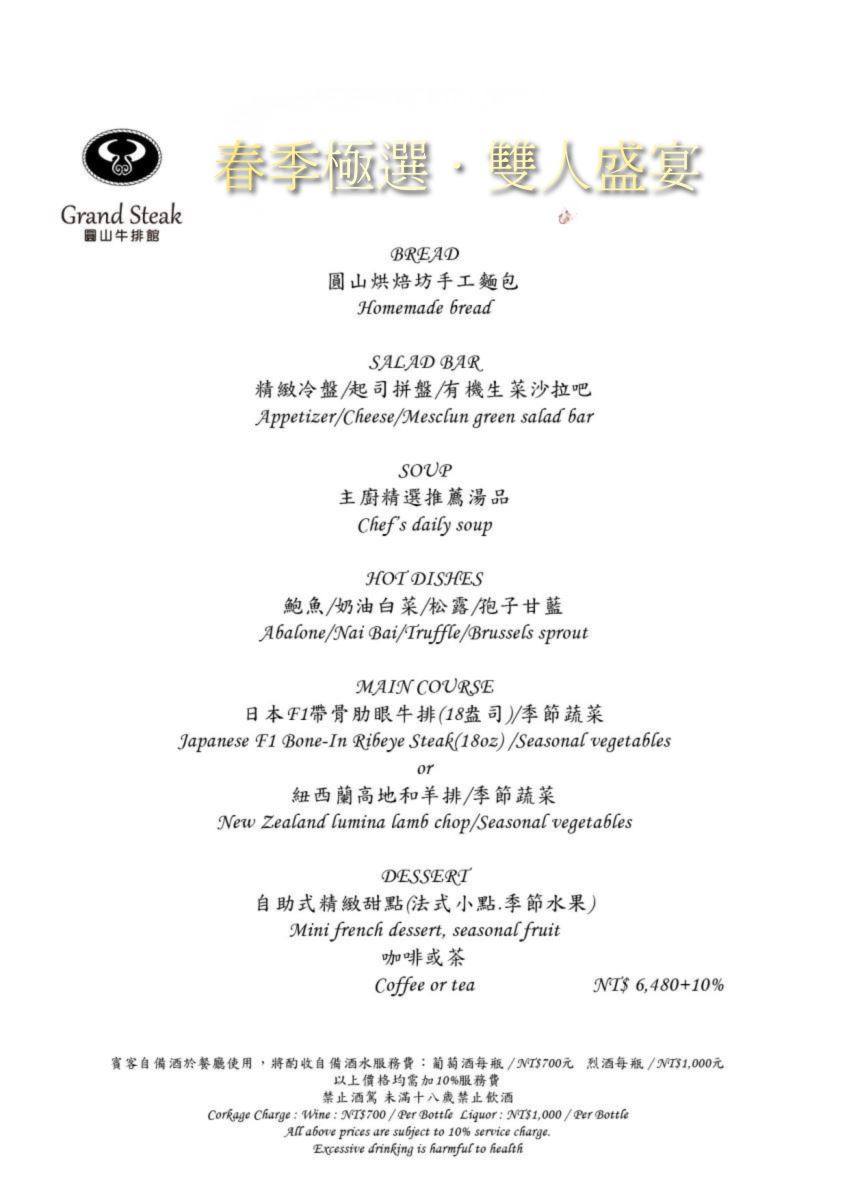 當春風輕拂的季節來臨,把相聚交給一桌限定雙人套餐。圓山牛排館以季節風味為主軸,嚴選日本 F1 帶骨肋眼牛排(18盎司)與高地羊排雙重選擇,佐以精緻前菜與甜點收尾,讓味蕾隨著春日節奏慢慢甦醒。兩人共享,是最溫柔也最動人的餐桌風景。